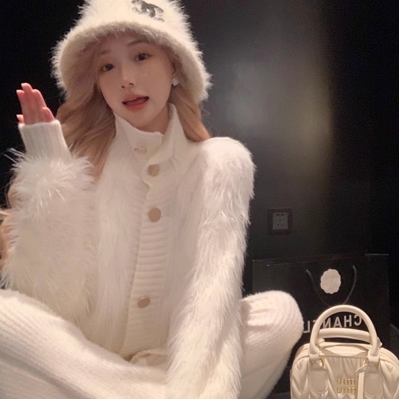 レインボー ショート丈 ニット カーディガン トップス ショート 袖あり 長袖 ドロップショルダー 萌袖 Vネック 襟なし もこもこ モコモコ ふわふわ 前開き かわいい 大人可愛い カジュアル